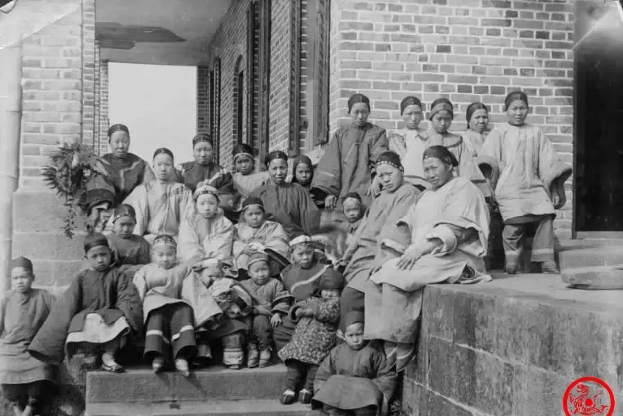 图中这一大伙人,穿得厚衣裳,一排一排坐石阶,都是那个年代的妇女和娃娃,气氛倒没谁拘着,大小人笑有的憨,有的腼腆,有的眨巴着眼紧抓着妈的袖子,这张合影能拍下来可不容易,岁数小的生怕老外镜头,一直拽着大人的手。