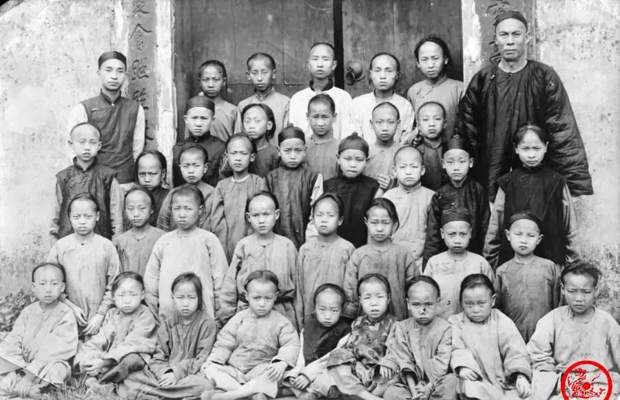 这个班底真全,先生站最旁边,一水的小学生顺着年纪排,衣裳颜色全是素净,不像现在学校校服讲统一,左边的老师穿得规矩,右边这几个小姑娘混在男娃里,细看能挑出来。