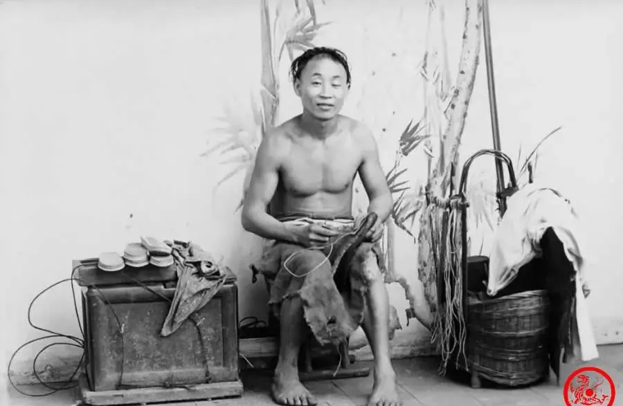这位鞋匠倒自在,脱了上衣露着膀子,膝头一块牛皮子搭着,两手正翻着鞋底,大地上摆着皮片牛筋绳,做鞋和补鞋全指这双手,小屋里夏天热,干起活来一身汗。