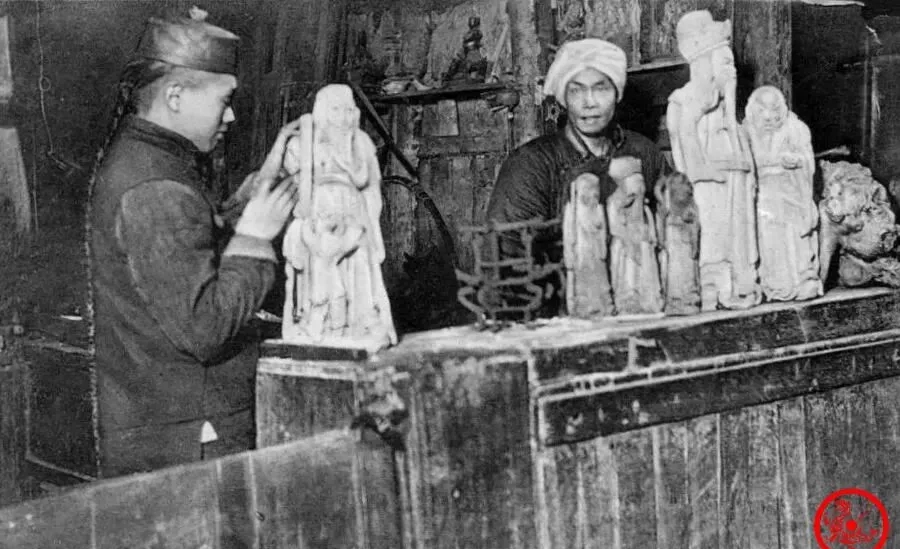 这一柜台上满是雕出来的人物,石头一块块顺着刀子走,左边师傅正细细修饰胡须,右边摆着观音、老爷、公孙般的成品,光影下每一尊像都有神气,雕好了就搁柜台让人来挑。