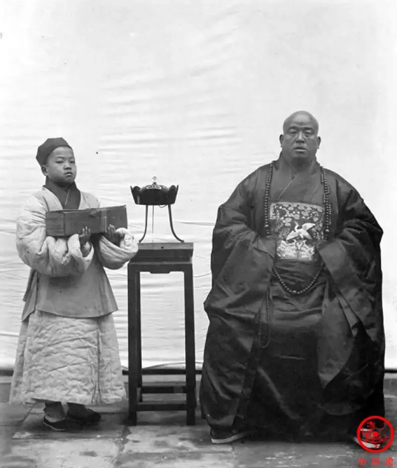 照片上,左一个侍童抱着书,右边那位大腹便便的僧人,胸口补子一块,身份不简单,有人家境殷实,坐着念经身上绣着官补子,这待遇当年可不是一般人能有的,旁边小孩拘谨兮兮地看着镜头,活脱脱一出老戏,看多了,才明白,那个年代的僧人,有时候也是半个社会大员。