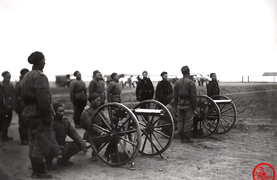 地上一排黑黢黢的家伙,轮子比人还高,周围一圈穿军装的士兵,这叫马克沁快炮,那个年代新鲜玩意,清军新练出来没几年,炮火一开,仗就能打出威风,爷爷曾说,这炮买来时是稀罕物,家里小孩都想瞄上一眼,现在看,谁还觉得稀奇,满大街的高科技啥样没有。