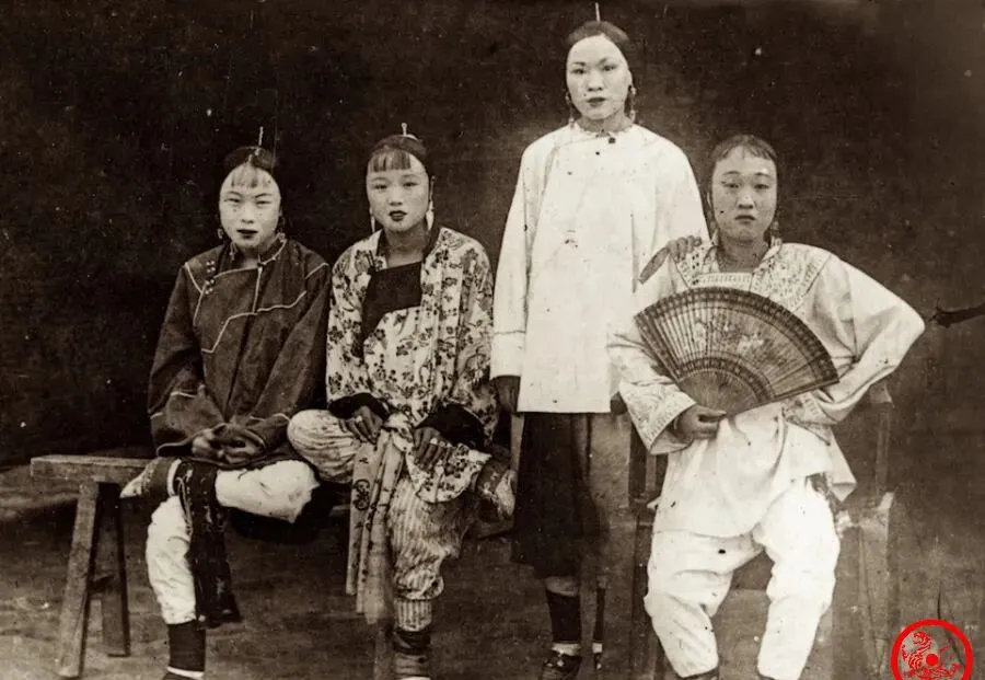 照片里的这几位青楼女子合影,坐的坐、站的站,打扮看着简单,大袖子、大花布,头发梳得全贴脑袋,刘海一刀切,眉心点一抹青,乍一看可不符合咱现在的审美,那时候要说她们能赶时髦,在城里算得上头牌,别看有点面无表情,实际下了楼可热闹着呢,老爷们都愿意来捧场,脸上油粉够厚,衣服上也讲究几道工序,那年月看谁顺眼转着圈就把钱花出去,一边说“就要她们这样的才算阔气”。