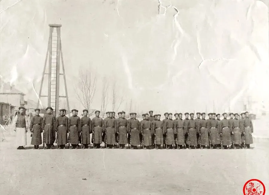 这是一群男人黑压压站成一排,穿得整齐,帽子底下露出眼神都不松懈,这个场面是上海的团练营地,门头匾额上四个大字“保卫闾阎”,门楣下还挂着牌子写着“营务重地禁止喧哗”,说白了就是维持治安的临时武装,看队伍站得笔直,一看就是刚训练出来,边上还杵着个外国人,跟本地兵勇合个影留作纪念,这种团练营过去没几年就都收归了,时代一大动,营地属地的都保不住。