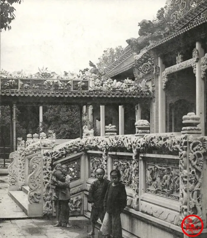 这里是广州陈家祠门口,图里那几个娃娃没穿鞋,赤脚蹬着石阶,斜着眼望着镜头,后头的屋檐梁上全是雕得满满当当的花纹龙凤,石栏杆上也不省劲,全刻着故事和水兽,岭南的手艺人真没省过力气,小时候我去南方亲戚家,老房子也有点这味,奶奶说“这房子里头住着的,家底不得了”,现在这样的屋还能逛到,进门一看就觉着气派,老广州的底子全刻在檐口上了。