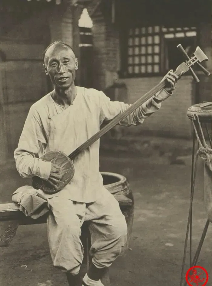 这张是北京茶馆里弹三弦的艺人,光着脚坐在板凳上,三弦抱在怀里,右手拨拉,左手按弦,脸上笑纹全露出来,后头的窗格子和大瓮一看就知道是旧茶馆,旁边桌上多半有老茶碗,唱一段单弦,听得人频频点头,一串门槛一只壶,茶馆里就靠这些个艺人在撑台面,爹那会儿说,下工摸黑回来,最兴奋的事就是听唱,头回听觉着单调,后来越听越带劲,入了门全是滋味。