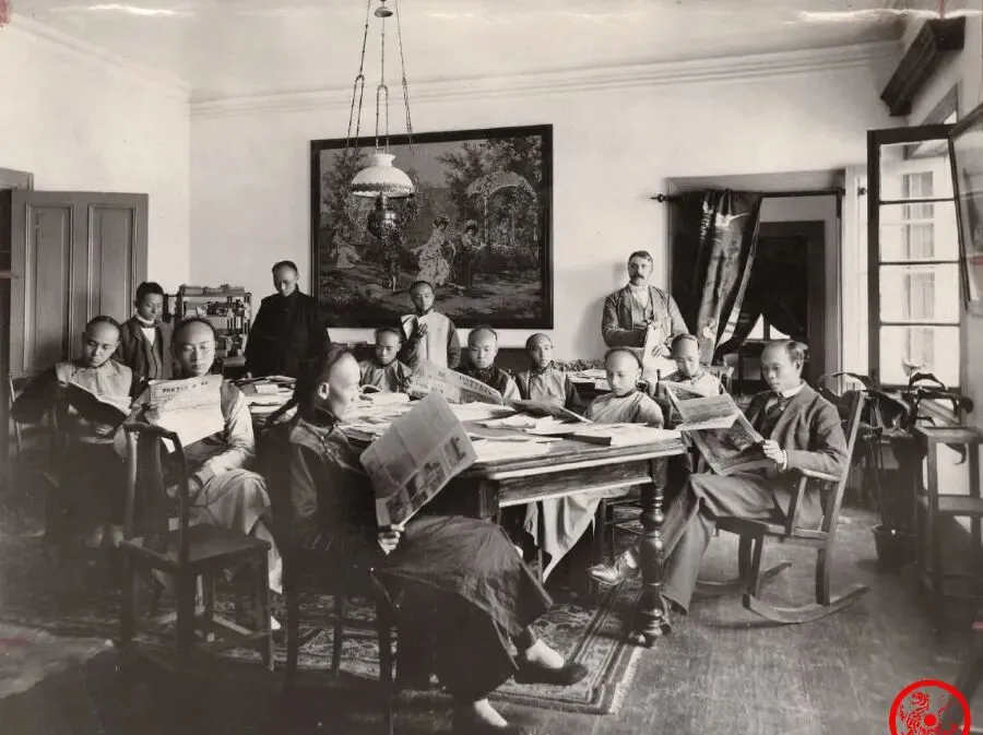 屋子里一圈人都低头看报纸,这张是晚清的读报场景,桌面上、椅子上、边墙靠着的全是一副沉浸式读报的样子,里头有穿长衫的,有披马甲的,还有一位老外站在最后头,报纸摊开遮了一半脸,那会儿不消微信,街头巷尾全凭报纸传话,知识分子有新鲜事就聚一屋,头碰头讨论,老一辈人常说,能天天看报就算赶上新潮流。