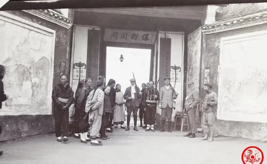 这个门楼正中挂着“保卫闾阎”,两边贴警示,十来个兵勇各持家伙,旁边站着几个穿洋服的老外,这是上海团练营军门口,团练平时保治安,真有事就顶上,见外人和本地兵一块合影,也只有那时候能见得到,现在的营房和过去的小楼大不同了。