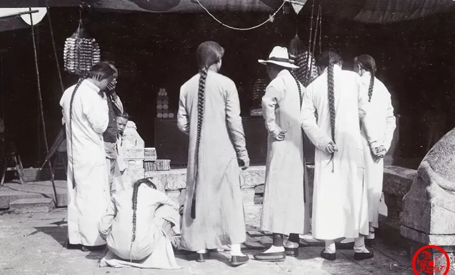 这张照片里,小伙子的大辫子油光锃亮,背对着镜头,长衫都快拖到地,辫子盘得细细长长搭在背上,旁边有的正蹲着翻书,地上码着一摞册子,这场景是城隍庙的书摊,小时候家里还留过一截大辫子,我爸对着那一扎头发感慨“以前要是没了它,日子就不自在”,编起辫子来又细又费工夫,十天半月才舍得洗一次,赶上有茶楼听书,背上一甩就跟着去了,现在年轻人讲究舒爽利索,这样的大辫子怕也就只能留在老照片里头了。