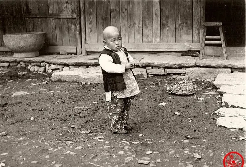 图里的小家伙一看就是门口溜达惯了,圆头圆脸,衣服上还粘着些泥点子,后面旧木门,地上一圈鸡屎狗毛,裤腿花花绿绿的,鞋脚踩得歪歪扭扭,低头皱着眉,像是在琢磨怎么挨过这会儿寒风,那时候的小娃娃呀,大人都埋头干活顾不上招呼,小孩冻手了也就搓搓揣揣,自己找乐,谁家也过不上精致的日子,可一个个都抢着往外跑不肯窝屋里。