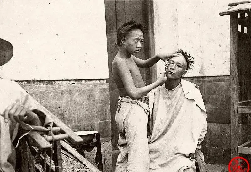 这个场景叫剃头摊上“半大小子顶门”,少年师傅光着膀子,胳膊瘦里带劲,手握刮刀正刮着大叔下巴,卷着白布围单,旁边洗脸盆、老椅子,风一吹刀片闪冷光,小时候爷爷说,你想吃碗面他可以拖几天,不剃头那是没法见人,旧时理发挣钱也不算少,一家三口全靠剃头摊维生,苦是苦点,但好歹混了个饭碗。