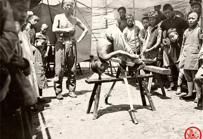 这个场景最让人提心吊胆,少年背朝下吊在刀板上,底下就是明晃晃刀口,围观的大人孩子都憋着气,那会儿很多穷苦人家孩子只要有点本事,就得出来挣一口饭,练成这样一身功夫,吃的喝的都得精打细算,真要不小心摔下来家里可承受不起,旧社会底层孩子啊,比谁都坚韧。