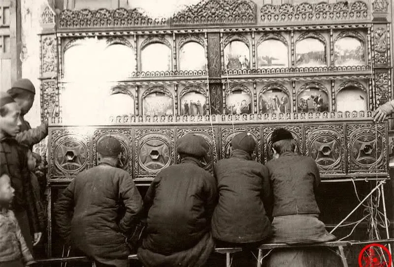 这个东西叫拉洋片,又有叫西洋镜的,木箱外壳雕着花,好几个孩子挤在前头,后脑勺排成一片,艺人摇动拉杆,一张一张图画在箱里翻,谁出两文钱就能钻洞眼看一回,有门道的人还会边拉边唱,解释画面内容,一群孩子看得入神,不吵不闹,每次拉完都跟着学里头讲的故事回家吹半天。