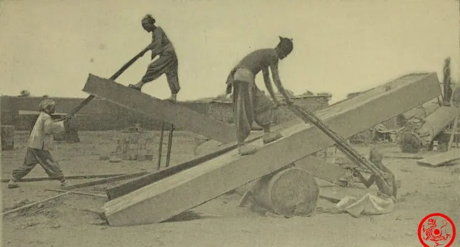 图中几个木匠弓着背推大锯,一个拉一个顶,全身带着汗,锯末扑扑飘在脚下,板材吱呀晃动,木工这一行,讲究手稳心细,做家具、盖房梁,少不得这一番体力活,比现在的电锯要慢多了,但做出来的东西细致结实,留得久。