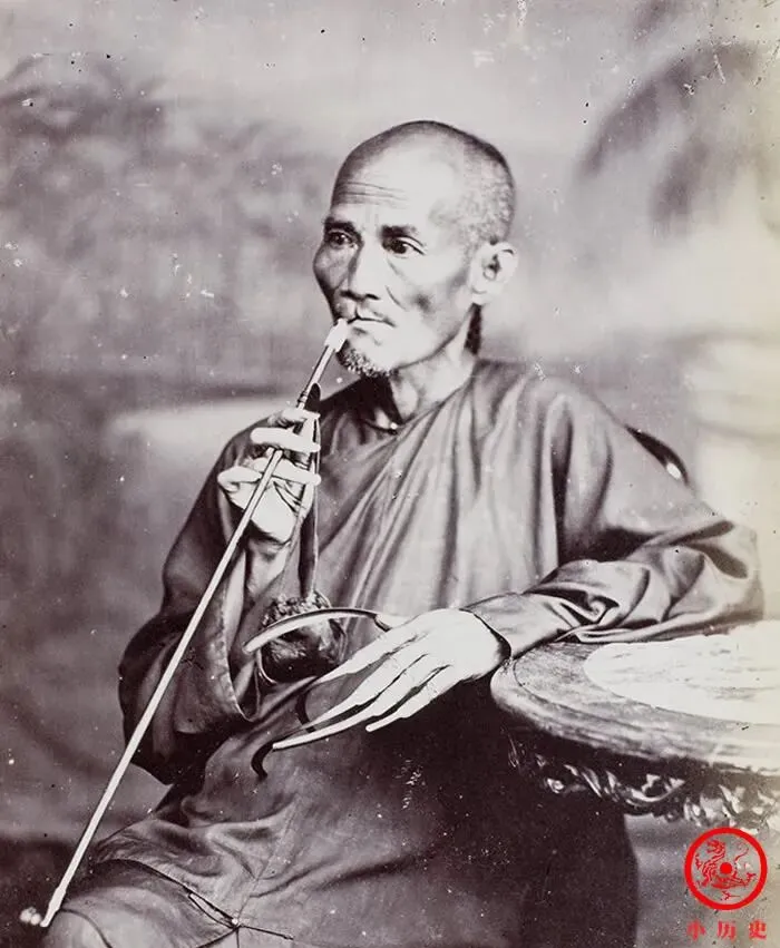 图中这位老人,手里夹着的不是稀罕物,就是旱烟袋,不过真要细看,最炸眼的还是那十指留着的长指甲,弯弯曲曲,又白又亮,一身宽大袍子搭着肩膀,神情安稳,手指头随意翘着,要是没见过还真难想象,旧时候居然有人特意把指甲养这么长。家里老人常念叨,**过去的长指甲可不是为了时髦,就是在告诉你,我这双手不沾活,养尊处优,出门端茶倒水,真动起土里刨食的事,人家用不上,干不来。**现在碰这样的指甲,多半是节目里的才看得见。
