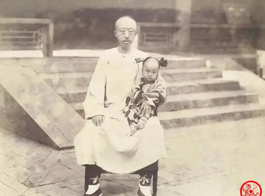 坐台阶上的老人是醇亲王奕譞,怀里的孩子,两只抓着衣角的小手特别眼熟。奕譞是清朝皇族里的大角色,一边要做好慈禧的妹夫,一边又是光绪的亲爹,前半辈子小心做人,到了后来天天提防着,怕哪句闲话传出去。家里老人讲过,过去王爷公子的日子表面风光,心头的那点苦没人诉,尤其遇着家里大小事,一个不当心容易被人记恨,这张照片里规矩气氛紧,老亲王抱孩子的动作都带着点生分,可那双小眼珠子看着镜头,谁家老照片里没见过一样的目光。