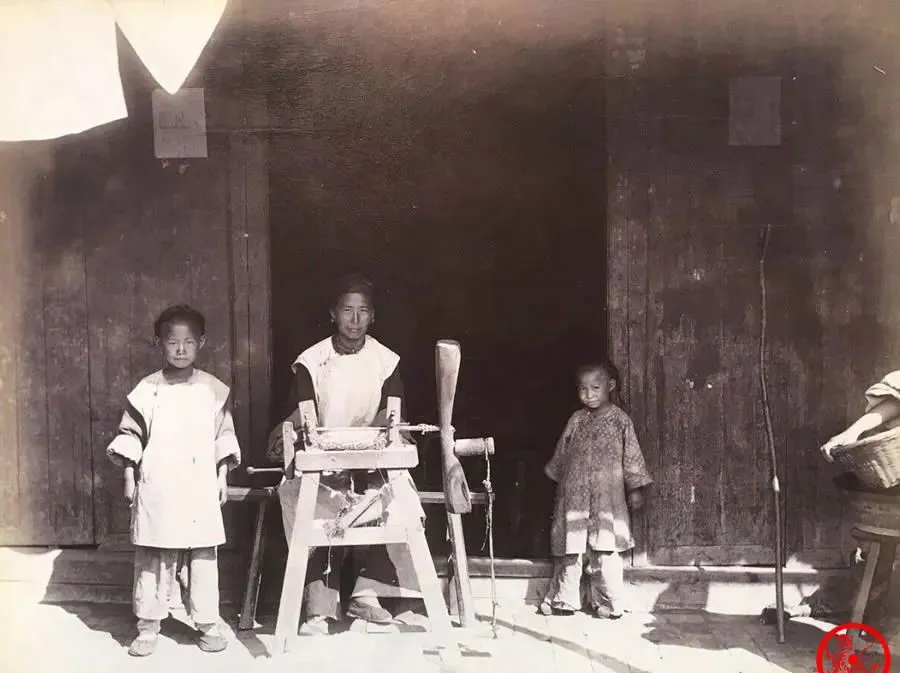 这张站在门口的母子三人,一台简易机械摆在大门前,具体干啥的说不上来,金属架子和手摇把子,做的是手上活计,看着像是纺线或者削面用的,把家里妇人做手工的场景拍下来,那时候人不管男孩女孩家里都得搭把手,活计不上心家里日子就紧巴,现在机械生产速度快了,谁还见过这样全家都站门前干活的景象,老照片就是能定住那点岁月里的精气神。