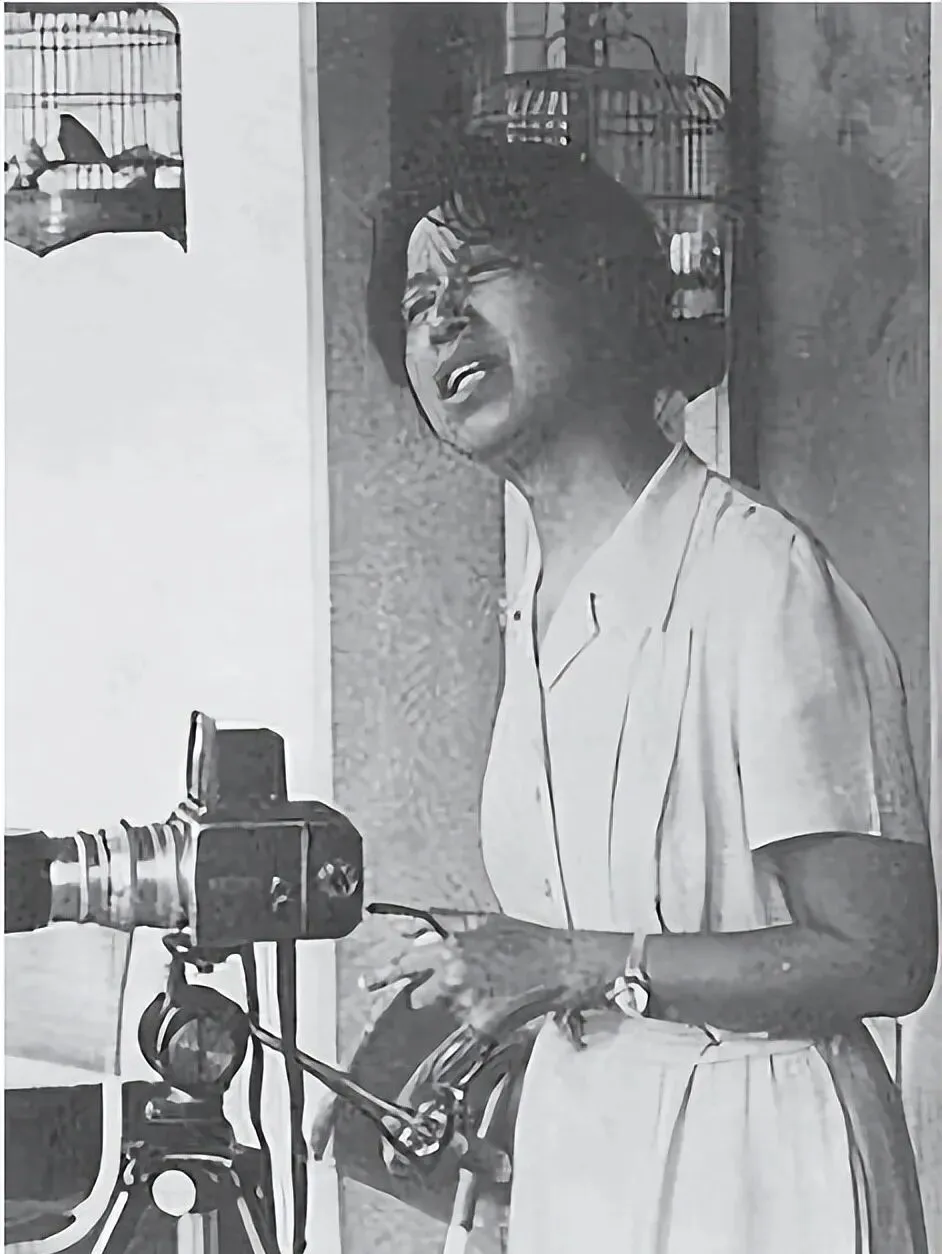 最后这张江青又回到镜头前,这一回是在屋里墙边,头发有点乱,嘴里叨咕着什么,手还拧着照相机的转盘,边上挂着鸟笼,拍照拍着还和鸟唠嗑几句也不是稀罕事,爷爷说那年头家里养小动物,照相的时候都得放在镜头里凑个景,小细节隔半辈子看,味道还挺新鲜。