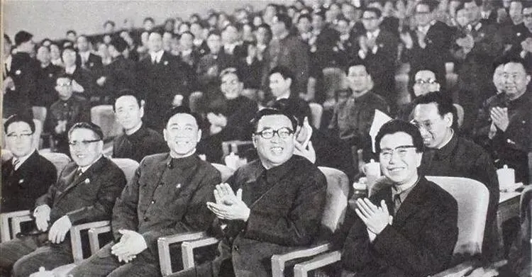 照片近处是个神情特写,光线一打,额头上的褶子压得深,嘴角收着一层倦怠,眉毛拢起,看得出来不是普通的合影,每个人都坐得板正,憋着一肚子话,江青视线偏下头,像是盯着会场某个角落发愣,气场在那一瞬间全散掉了,老妈说她年轻时见过江青的宣传照,这样没力气的模样还是头一次见,背景里的几排座椅全都竖着卡其色套,光打下来反而折射着一股很压抑的气息。
