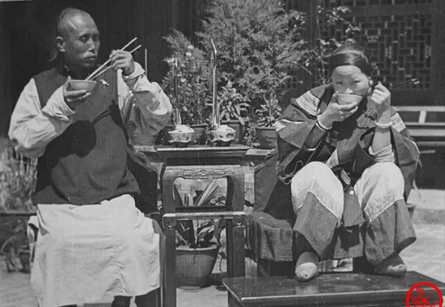 图中这两口子,一张桌子隔开,中间是两碗饭,男人板板正正坐着,女人弓着腿把碗贴近了脸,胳膊肘还紧着,跟现在的夫妻吃饭可不一样,没搅一块儿,有些各吃各的疏远劲,奶奶年轻那会儿说过,谁敢在饭桌上耍脾气,那是把日子往外掰,那时候女人遇到横的,家里的气是咽下去的,没有地发。