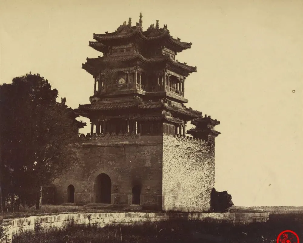 这张里头的高楼,叫文昌阁,在清漪园里头,庄严不张扬,几层檐角起翘,角楼子正正立着,底下的门洞一排三口,外墙灰扑扑的,估计当年擦墙的太监都逃散了,一点彩色都没剩,楼顶雕花还在,只有看细节才知道那年代的工匠下了真功夫。