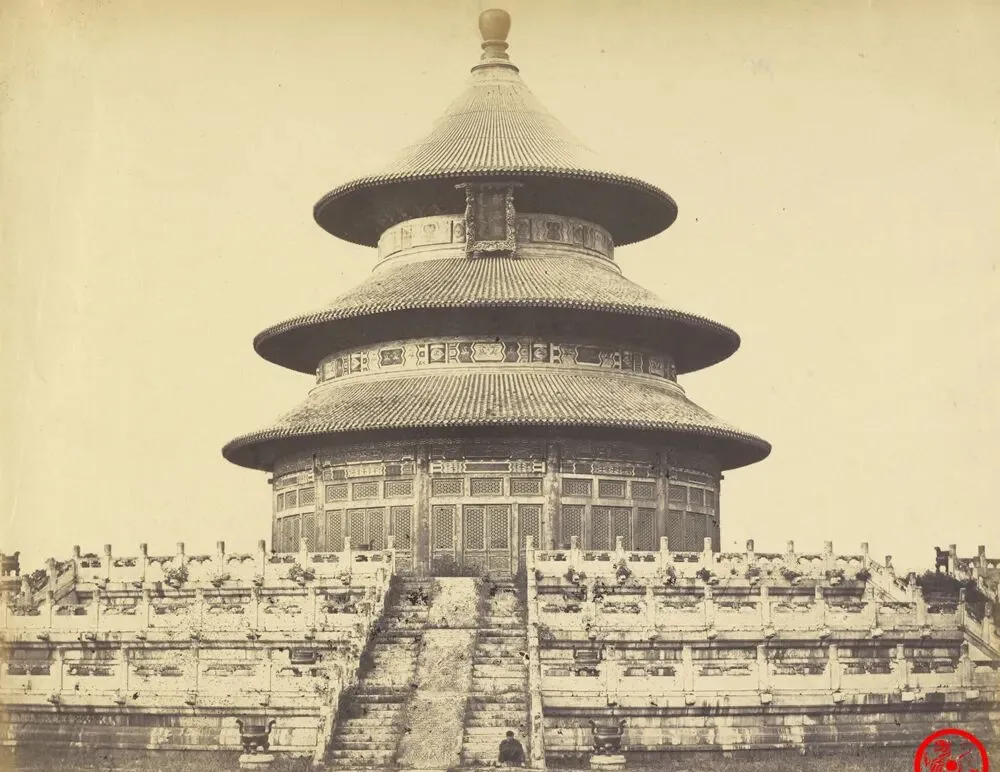 天坛祈年殿这照片定格的就是烧毁前老“圆殿”,好几层屋檐叠上来,顶上金色宝珠镇着,台阶每级砖缝里藏灰,围栏还算周正,拍这照片得挑个大晴天,光一照圆顶光可鉴人,这殿后来被雷火化了灰,现如今修得再像,细节也回不去了。