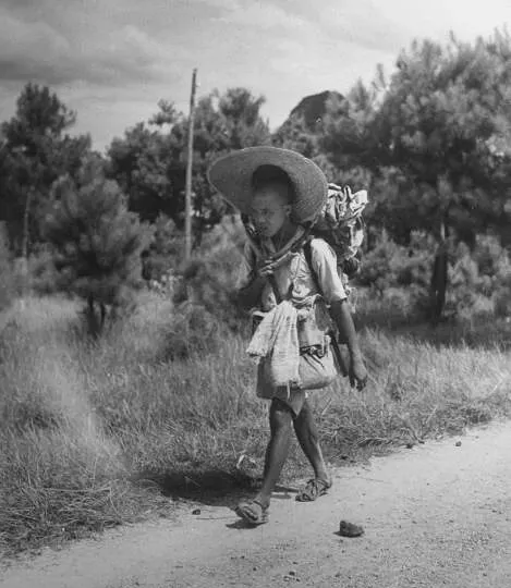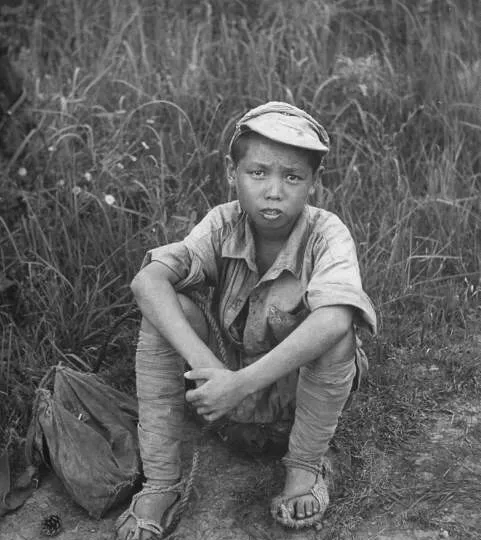 图中这个坐在草地上的男孩,身上穿得破破烂烂,脚底下那双草鞋,竹叶绳麻绕得粗粗糙糙,小腿绑得结结实实,他眼神看着镜头发愣,比同龄人多了点苦味,衣服也皱巴巴的,像是刚从路上滚过一身野草灰,一旁扔着破布袋,有点无处安放的感觉,也许前一天背着家当跑得太久,脚板硌得痛还来不及喊疼。