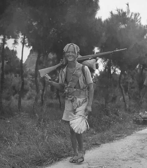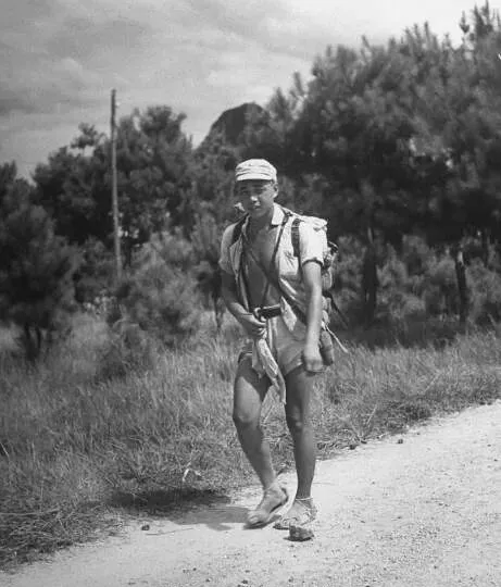 这位小伙子肩上扛着一杆枪,脸上带着笑,看着比周围的人精神些,一手还拎着把自制蒲扇,汗水糊了半边额头,草鞋一只比一只歪,脚面蹭得全是坑坑洼洼,小腿绑腿松松垮垮,他这一笑,有点孩子气,队伍里能笑出来的人不多,苦里带乐,就这样走下去。