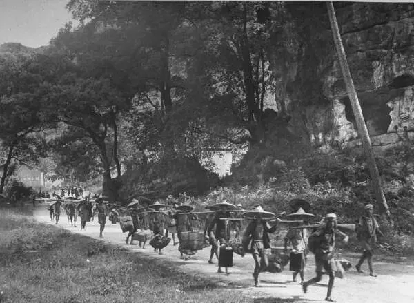 图里一整条路全被挑担的兵和民工占满,帽檐子挨着帽檐子,路边老树弯下来,影子给路上留了点凉快,队伍一波接一波,扁担上挑着家什,布口袋、脸盆、铁桶、锅什么都有,肩膀压得直线弯,脚上全是一样的草鞋,后头扁担嘎吱直响,前头喊一嗓子整队,后头就跟着应声,全是老办法,一分不乱。