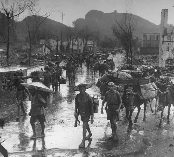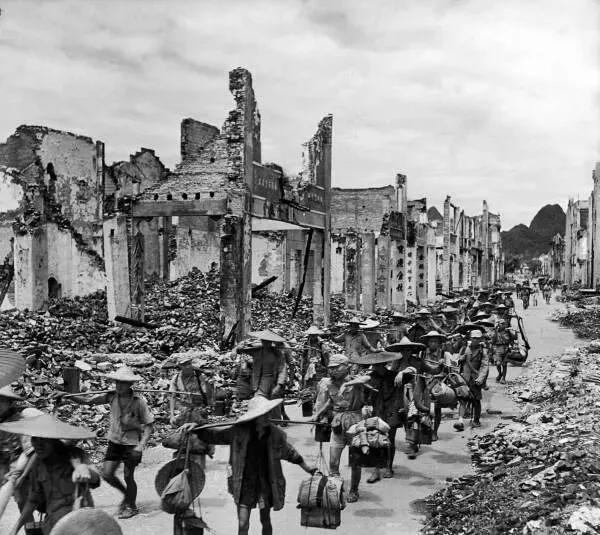 满地是碎砖烂瓦,门楼还立在那里,只剩半截墙,队伍照样往前赶,那些穿着草鞋的人和难民混在一起,谁也没法细想下顿饭在哪儿,挑的也许是全部家当,有人拉着自家小孩,有人推着独轮车,废墟边上路还在修,风拿大了,灰直往衣领里灌,大家的步子没慢,瞅着这场景,心里都是一抹憋屈。