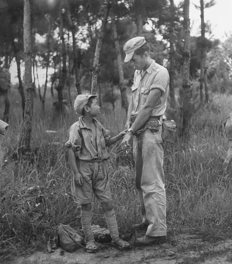 照片里小兵仰头和高个子说什么,两人鞋子都是一派狼狈,一个是全身泥灰的小兵,一个是身板挺直的洋人,气氛里带点拘谨又带点新鲜,小兵的双手不自觉捏在一起,鞋带快断了似的,还死死结着,旁边树影斑驳,看得出来彼此有点距离,也许那一刻谁都觉得对方有点怪,不过话说回来,战争的年代,这样的短暂谈话也算是生活的缝隙里冒出来的微光。