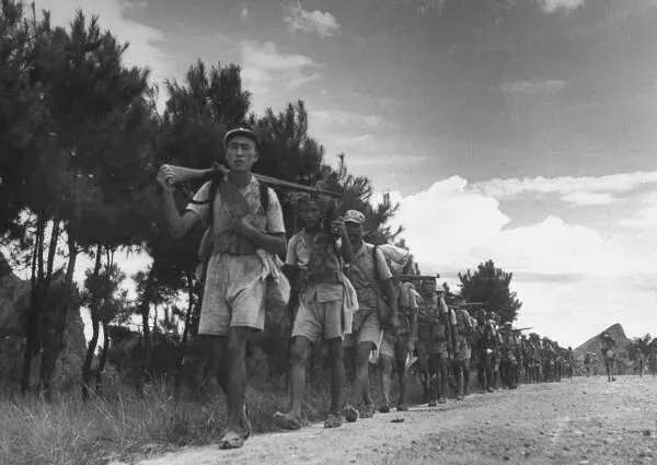 这一队士兵穿着短打行头,肩头扛着家什,有人干脆赤身露臂碎布搭在两肩,阳光底下皮肤晒得黑油油,脚下都是草鞋,有的还用布扎了两圈,队尾跟着挂了几只水壶,重担全靠肩膀一骨碌顶着,他们头抬得高,脚步迈得快,脸上汗水和泥巴混一块儿,也没空管脏不脏,光看这架势,真不是一般的好体格。