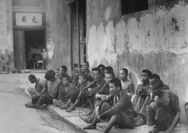 照片上一排人坐在街头,穿得单薄,有圆脸的、瘦高的、老少混杂,脚上也大多是草鞋,有人眼神呆呆的,双手抱膝,一把草鞋就是全部家当,墙皮都脱落了,大家的神情都写着疲惫,苦日子不是光喊一喊,是真真切切坐在身上的那种沉重。