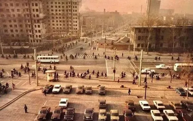 暖黄色的滤镜里,数不清的自行车汇成了流动的河,人们穿着朴素的衣裳,攥着车把,朝着各自的方向赶去。路口的岗亭里,交警正指挥着交通,几辆老式公交车和小轿车点缀其间,远处的楼房还带着未脱尽的工业气息。