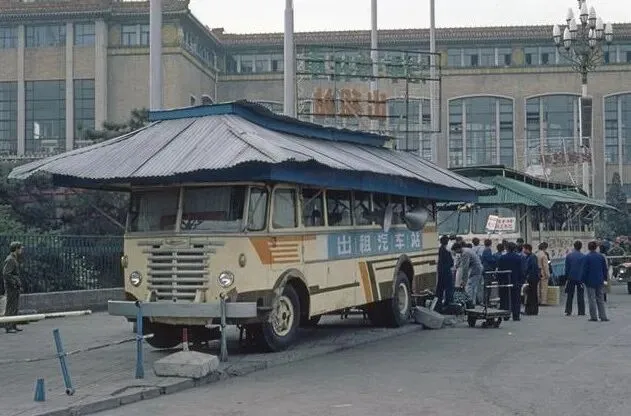 再看这张站前的出租汽车站,一辆改装成候车亭的旧巴士格外扎眼。