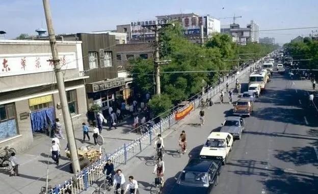 蓝白相间的护栏把人行道和车道隔开,路边的 “东单菜市场” 招牌格外醒目,蓝布门帘后,进进出出的人们提着菜篮子,和摊主讨价还价。马路上,自行车流依旧是主角,几辆老式出租车和公交车缓缓驶过,路边的大树投下斑驳的树荫,连电线杆上的电线都带着旧时光的慵懒。