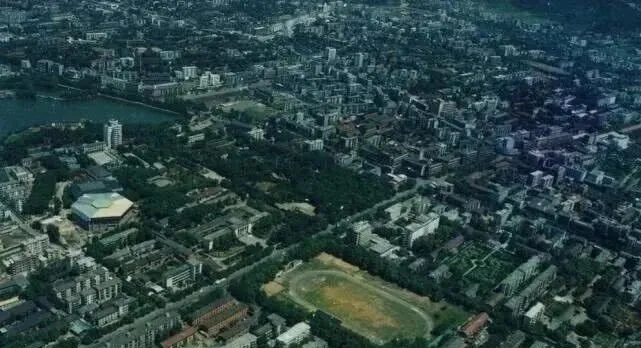 这个角度换成了绿油油的体育场,四周全是老树,最亮眼的还是那一圈露天跑道,上面天天有人锻炼,学校里搞运动会,老师让我们提前几天就穿着球鞋去“踩场地”,到现在路过那一带还记得脚下的沙土味儿。