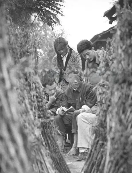 图里几位叔伯扎堆坐在小板凳上认真读本子,货真价实的田头识字班,那年月大伙儿识个字,回来就能跟队会计唠账目,趁着农闲读两章,算是全家人的面子,只有经历过的才明白,“一个工地一晚上能记住三十个字,那是真不简单”,有点意思。