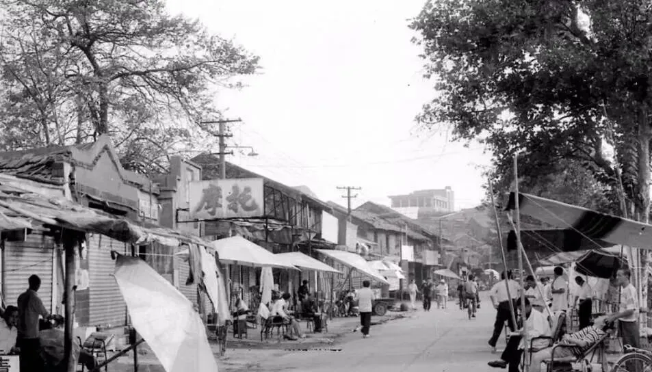 照片这排搭着篷布的摊子,就是八十年代荆州最地道的集市,大太阳底下,一溜烟儿摆开各家小买卖,卖菜的、磨剪子的、糖画的都有,邻里人打个招呼就凑堆说家长里短,一有新鲜货全巷都沸腾,现代超市再大,也搅不出这样的热闹气氛。