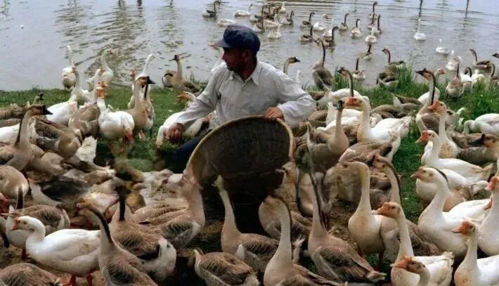 图中那一大圈白鹅围着老大爷,手里的簸箕一甩一撒,咯咯嘎嘎的声音伴着湖水一直传,小时候路过,经常被鹅追着跑,衣裤上沾一脚泥,长大后才体会,养禽的人有自己的节奏和乐趣,鹅群背后其实就是一家老小的生计。