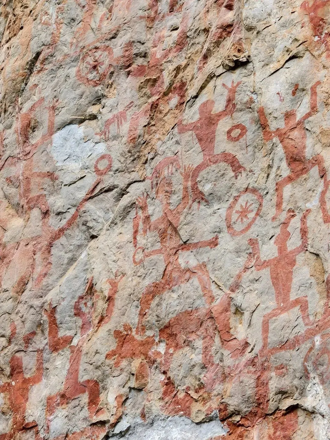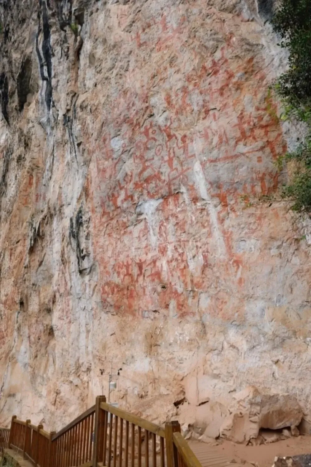 其临江崖壁画幅宽221米、高约40米,面积达8000平方米,有1951个赭红色剪影图像,以蛙形正身人像为主,辅以铜鼓、刀剑、动物等,再现古骆越人的祭祀、庆典与征战场景,颜料为赤铁矿粉混合动物脂肪。