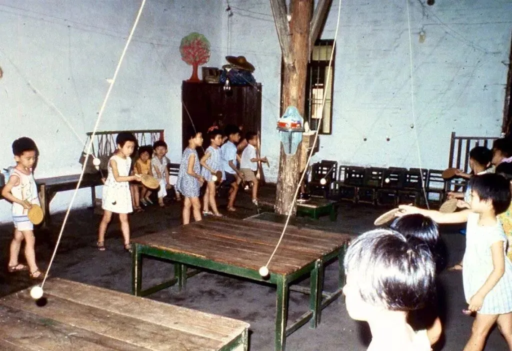 9.孩子们正在练乒乓球,乒乓球用绳子拴着。