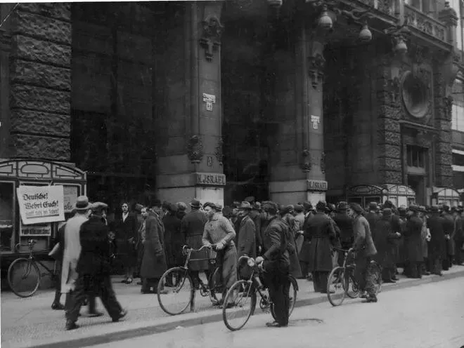 德国柏林,一家被纳粹抵制的犹太人商店,店前不少看热闹的柏林老百姓。