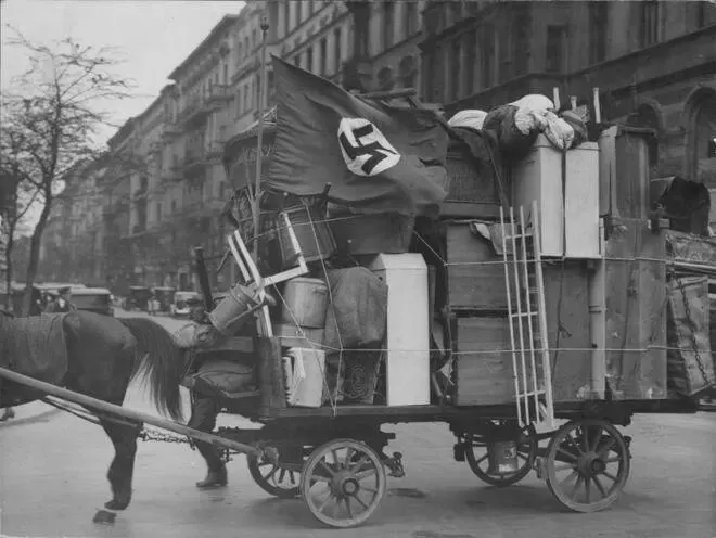 4 月 1 日,柏林,在抵制犹太企业期间,纳粹的马车上装满了收缴的犹太人的货物。