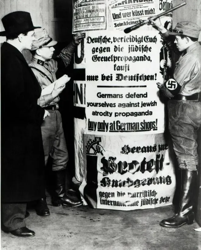 1933年4月,德国冲锋队成员张贴抵制犹太人的海报,海报上写着“德国人保护自己免受犹太宣传的影响,只在德国商店购买。”