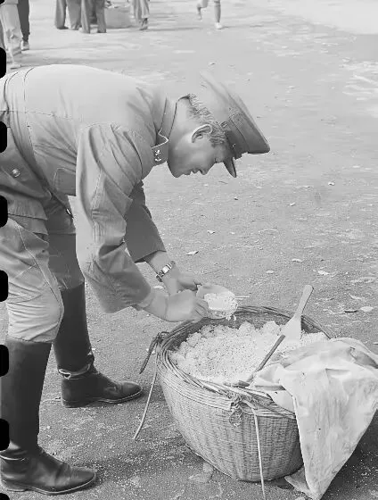 - 孙立人弯着腰,从竹编大箩筐里为自己盛饭,没有侍从,没有特供,动作熟练得像个普通士兵;