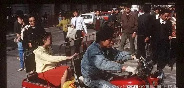 图里那个小摩托,一上街就是人眼里最拉风的造型,女孩子坐后排,手一搭扶手,司机戴顶毛线帽子,前面车灯亮着走,路边不时人投来一眼,八十年代末到九十年代,摩托简直是家里最宝贝的物件,家里有辆摩托,邻居都得来借着兜风,小孩跑来喊着也想坐一圈,街头快递、摆摊做生意,摩托鸣笛一响谁都想看看是谁,这场景现在真看不见了。