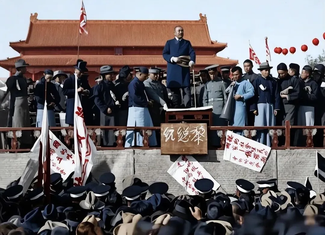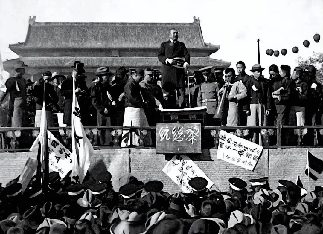 这张照片拍摄于1923年10月10日的北京天安门广场,当时蔡元培等知识分子发起了“裁兵运动”,召集数万民众在天安门集会,黎元洪作为大总统受邀出席并发表演说,承诺支持裁兵以减轻民众负担。