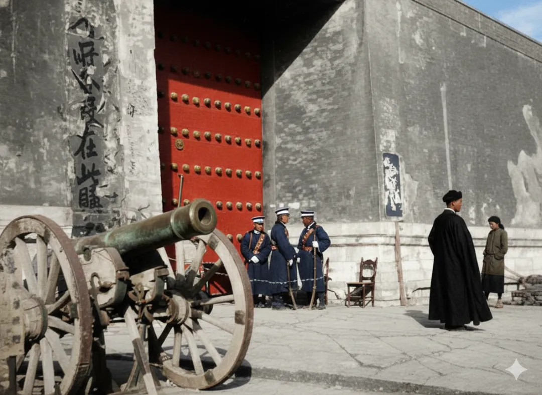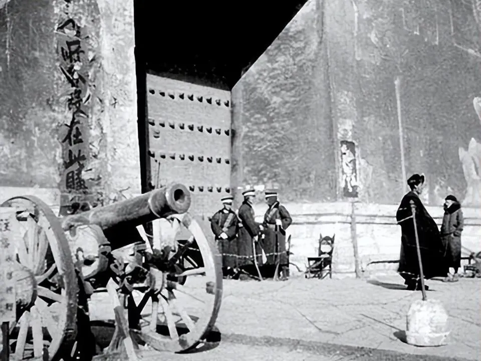 照片中的城门处于半开状态;守门的士兵是民国政府的军警,他们的职责是维护博物院的安全,这门火炮是清代宫廷遗留的旧式神威大将军炮,属于历史陈设,它的炮管角度固定,仅作为故宫历史景观的一部分。