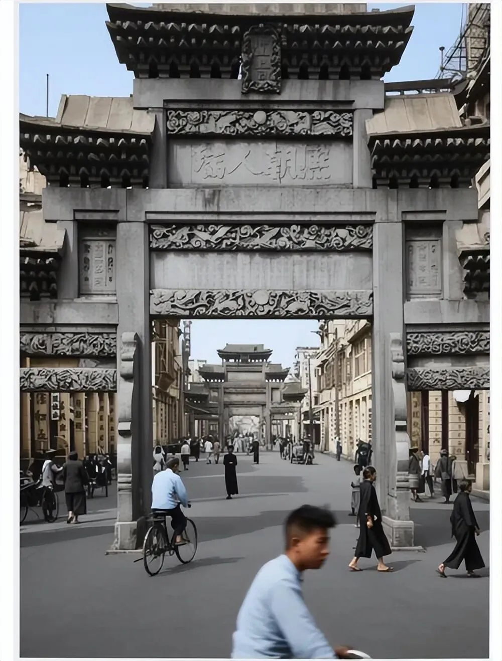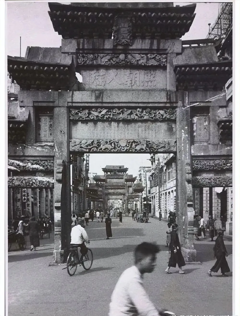 1930年,北京前门外大栅栏商业街。牌坊上的题字是“熙朝人瑞”,“熙朝人瑞”牌坊是清代为表彰长寿老人而建的功德牌坊。